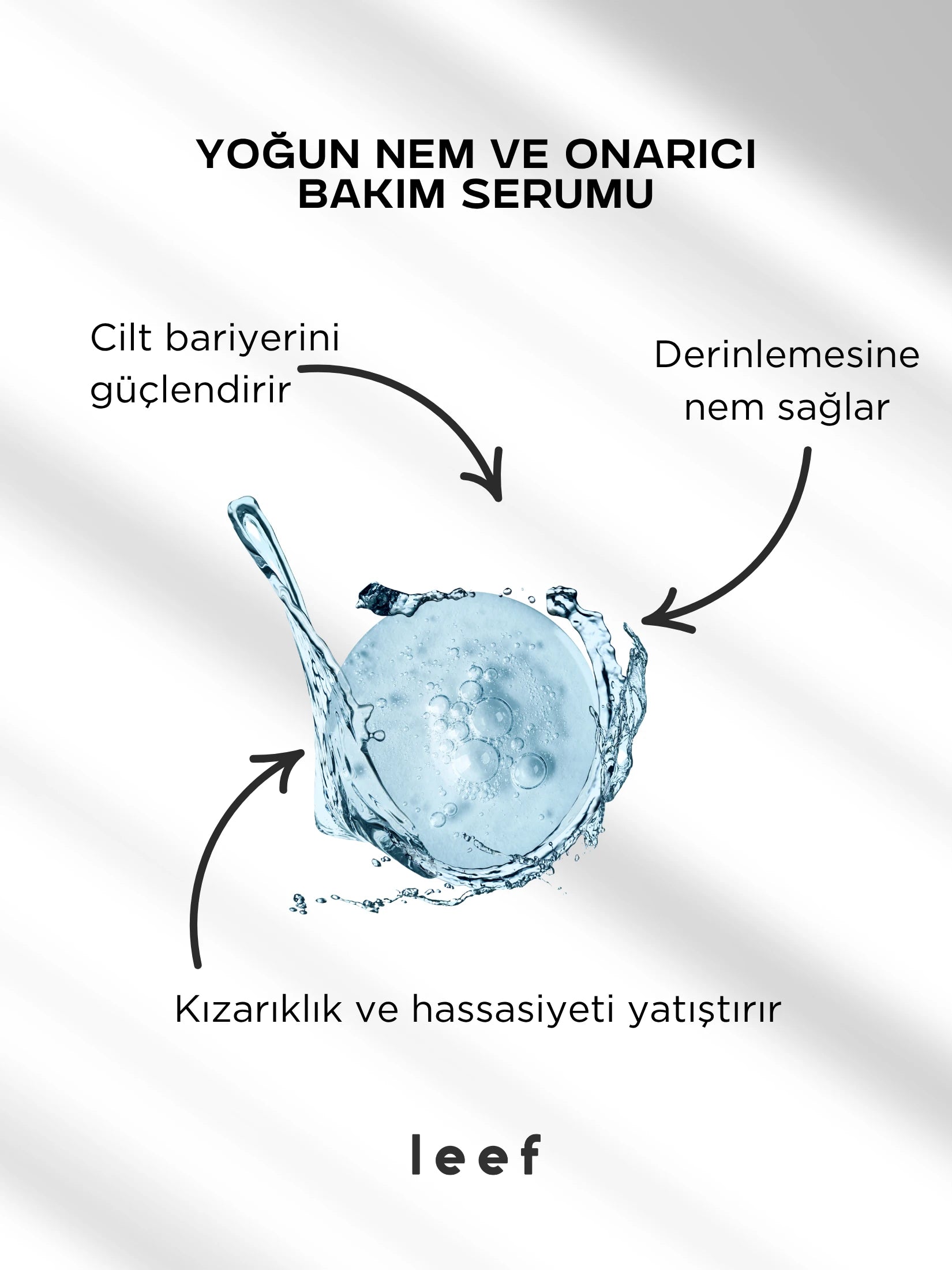 Hyaluronik Asit, Vitamin B5 (Panthenol) ve Centella Asiatica birleşerek cildin nem dengesini güçlendirir.