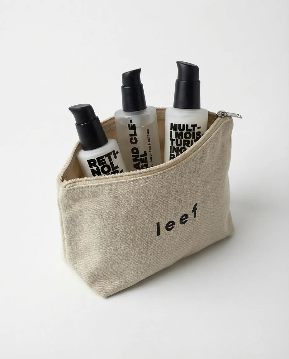 Leef’in sade ve zamansız yaklaşımıyla tasarlanan bez makyaj çantası, günlük kullanım ve seyahatler için pratik bir düzen sağlar.